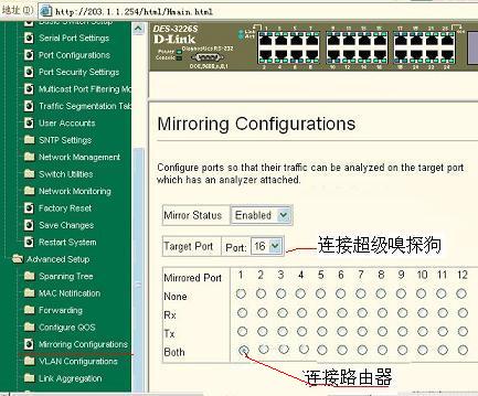 如下圖所示,此例中把1號(hào)口鏡像到16號(hào)口,從而在16號(hào)口安裝監(jiān)控軟件,即可實(shí)現(xiàn)監(jiān)控。