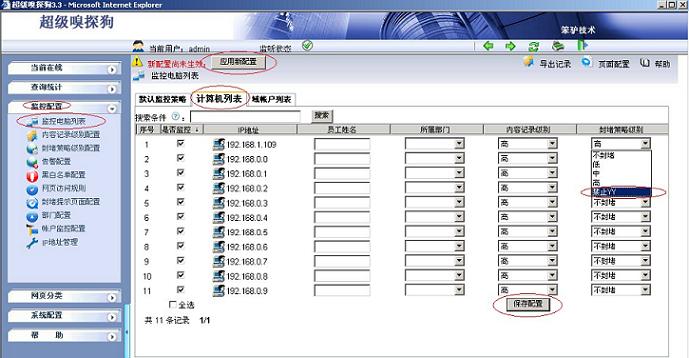 (2)在“監(jiān)控配置-- >監(jiān)控電腦列表-- >計(jì)算機(jī)列表”中應(yīng)用封堵規(guī)則,如下圖所示: