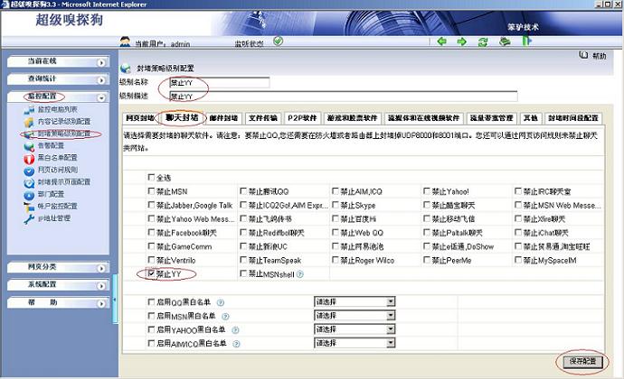 (2)打開(kāi)超級(jí)嗅探狗,在“監(jiān)控配置-- >封堵策略級(jí)別配置-- >編輯-- >禁止YY”,配置如下如所示: