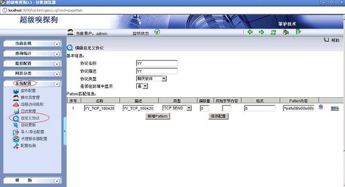 (1) 在“系統(tǒng)配置->自定義協(xié)議”中點(diǎn)擊“ 新增自定義協(xié)議”增加一個(gè)自定義協(xié)議,命名為YY,協(xié)議類型選擇“聊天軟件”,如下圖所示: