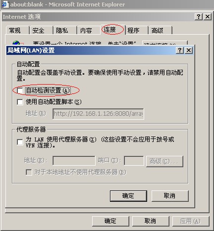 另外,如果IE的“局域網(wǎng)(LAN)配置”是“自動檢測設(shè)置”,有時也會導(dǎo)致打不開localhost,建議把“自動檢測配置”關(guān)閉掉,如下圖所示: