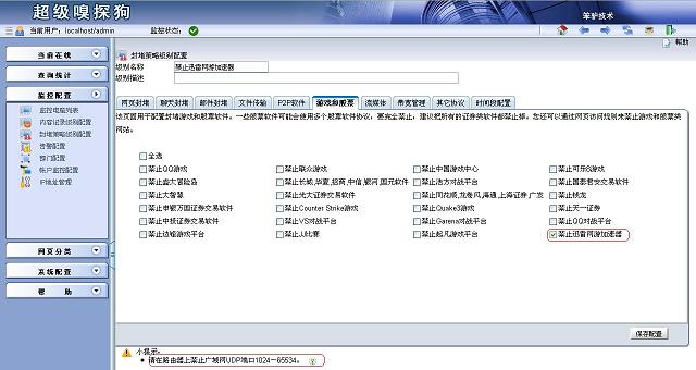 因?yàn)閯偛判略龅膮f(xié)議中添加的信息為“游戲股票軟件”的“迅雷網(wǎng)游加速器”,因此在“新增封堵策略級(jí)別”中的“游戲股票軟件”找到“禁止迅雷網(wǎng)游加速器”并勾選,填寫級(jí)別名稱并保存配置。 注:要禁止迅雷網(wǎng)游加速器必須在路由器中禁止廣域網(wǎng)UDP端口1024-65534。5.對(duì)相應(yīng)電腦配置本封堵策略
