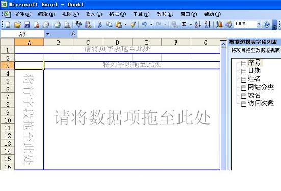 步驟4:將右邊數(shù)據(jù)透視表字段列表中的字段(姓名、網(wǎng)站分類、域名)雙擊添加,并把“訪問次數(shù)”在下拉列表中選擇添加到“數(shù)據(jù)域”,在左邊的區(qū)域中將會顯示統(tǒng)計(jì)后的結(jié)果。具體結(jié)果如下圖所示: