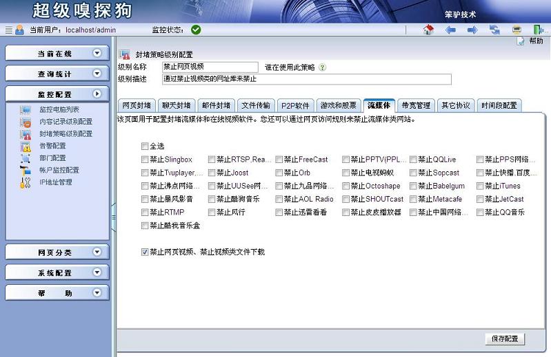 首先,您需要在監(jiān)控配置->封堵策略級別配置中,新增一個封堵策略級別,取名為“禁止網(wǎng)頁視頻”,在網(wǎng)頁封堵選項卡中,勾選流媒體中的“禁止網(wǎng)頁視頻、禁止視頻類文件下載”,單擊“保存配置”。具體如下圖所示: