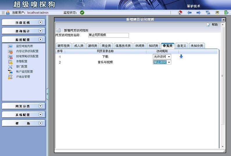 首先,您需要在監(jiān)控配置->封堵策略級別配置中,新增一個封堵策略級別,取名為“禁止視頻網(wǎng)站”,在網(wǎng)頁封堵選項卡中,勾選“啟用網(wǎng)頁訪問規(guī)則”,并在后面的下拉列表中,點擊“新增”。具體如下圖所示: