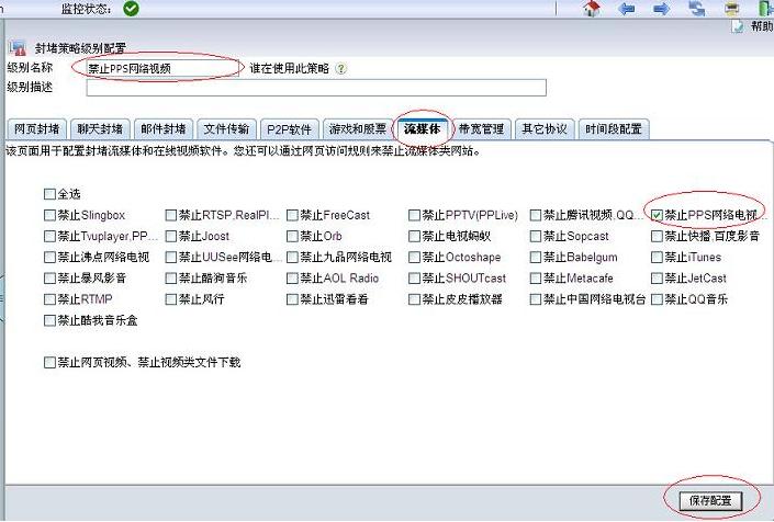 1.先新建一個(gè)封堵策略,名為“禁止PPS”,選擇“流媒體”,勾選“禁止PPS網(wǎng)絡(luò)電視”,保存設(shè)置。