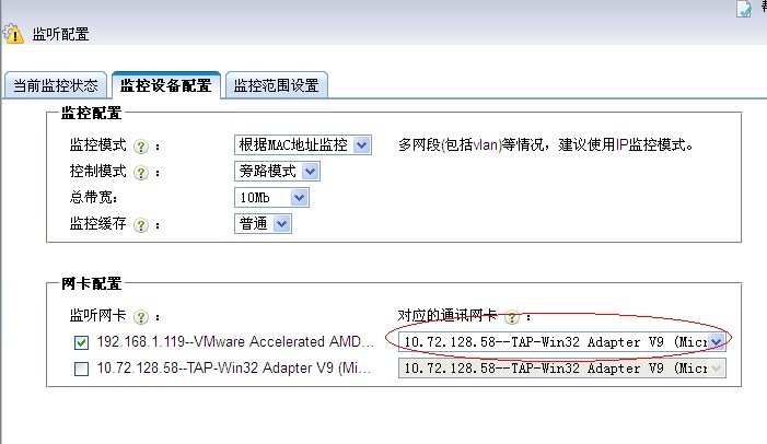 - 4. 點擊“系統(tǒng)配置”—>“監(jiān)聽配置”—>“監(jiān)控設備配置”,選擇新添加的網卡作為通訊網卡。