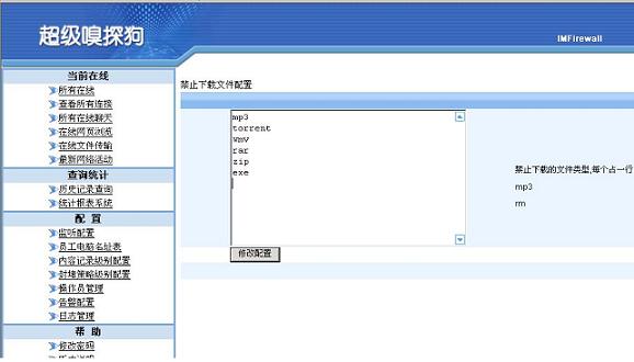 如果是要禁止從網(wǎng)頁(yè)上面下載文件,需要在超級(jí)嗅探狗的封堵級(jí)別里面啟用“下載文件控制”,然后把不允許下載的文件類型添加在“下載文件控制”列表中。如下圖所示: