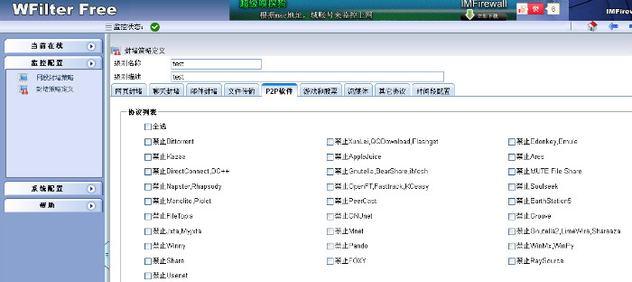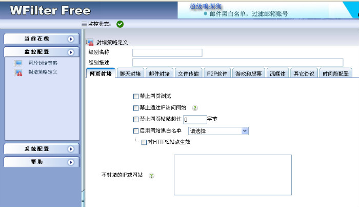 打開WFilter Free進入到監(jiān)控配置 -- 封堵策略定義,點擊新增封堵策略級別。