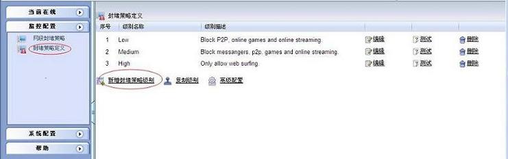 打開(kāi)WFilter Free進(jìn)入到監(jiān)控配置 -- 封堵策略定義,點(diǎn)擊新增封堵策略級(jí)別。