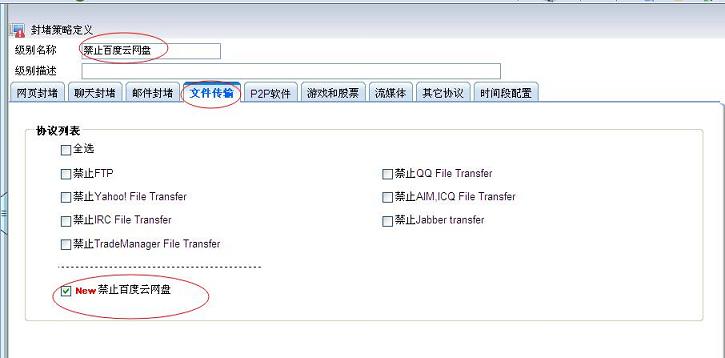 輸入級(jí)別名稱以及級(jí)別描述 (如:禁止百度云網(wǎng)盤(pán)),選中文件傳輸選項(xiàng)卡。