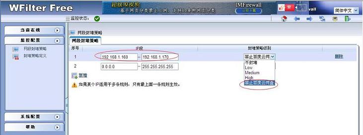進(jìn)入到監(jiān)控配置 -- 網(wǎng)段封堵策略,點(diǎn)擊新增,輸入想要封堵的網(wǎng)段如:192.168.1.166-192.168.1.170 ,封堵級(jí)別選擇新增的“禁止百度云網(wǎng)盤(pán)” 。