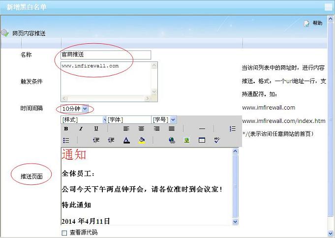 輸入級(jí)別名稱以及級(jí)別描述,(如:公司官網(wǎng)通知),選中網(wǎng)頁封堵選項(xiàng)卡,選擇“啟用網(wǎng)頁推送” ,點(diǎn)擊新增。