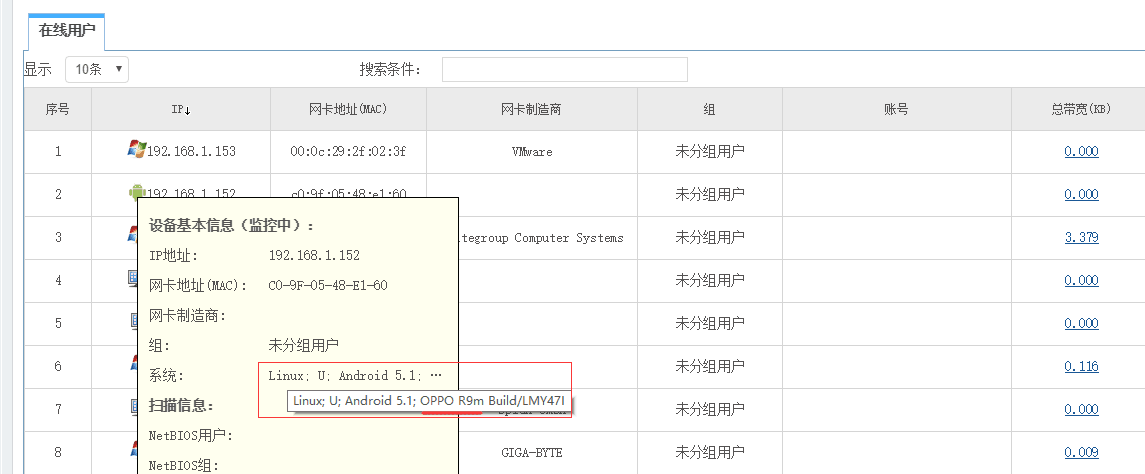 1.所有在線里面可以檢測(cè)到wifi下的被監(jiān)控設(shè)備具體型號(hào)