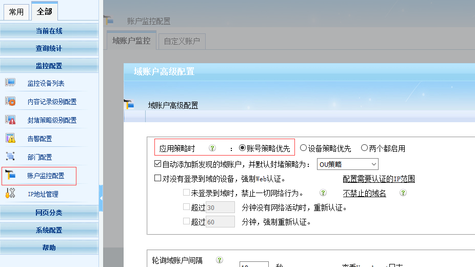 3. 在”賬號監(jiān)控設(shè)置“的高級設(shè)置中,把”策略應(yīng)用“選擇為”賬號策略優(yōu)先“。