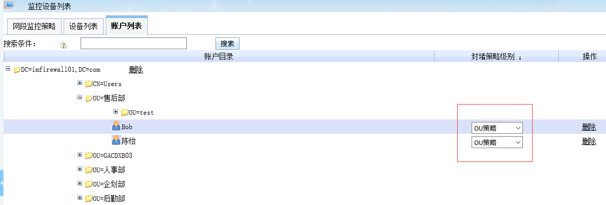 2. 在”監(jiān)控設(shè)備列表“的”賬號列表“中,給賬號設(shè)置真正的上網(wǎng)策略。
