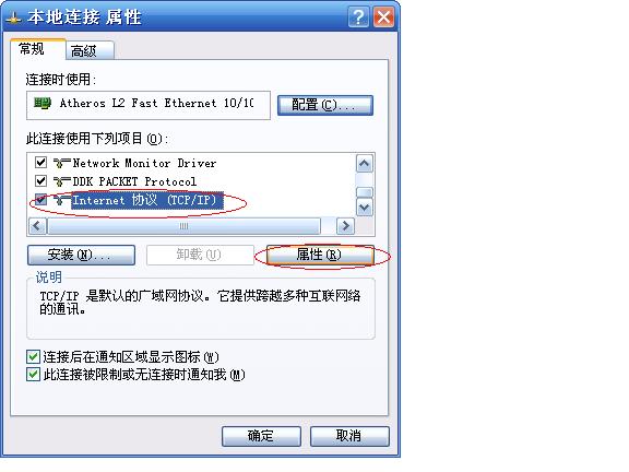 在常規(guī)選項(xiàng)卡中選中“Internet協(xié)議(TCP/IP)”,點(diǎn)擊屬性。