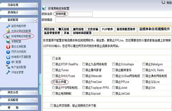 2.2 在“監(jiān)控配置->封堵策略級(jí)別配置”新增一個(gè)“ 新增級(jí)別”,級(jí)別名稱為禁止快播(Qvod)。在“流媒體和在線視頻軟件”標(biāo)簽下選中“禁止快播”的復(fù)選框點(diǎn)擊保存,如下圖所示: