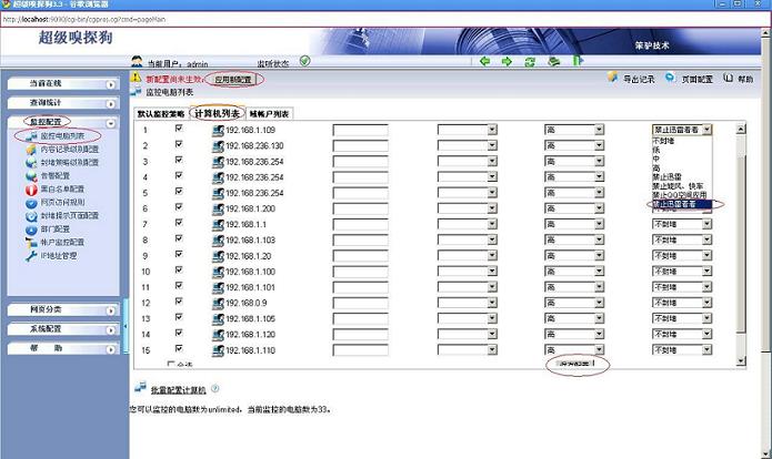 2.在“監(jiān)控配置-- >監(jiān)控電腦列表-- >計算機(jī)列表”中應(yīng)用封堵規(guī)則,如下如所示: