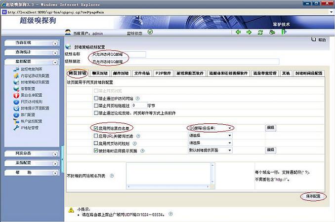 1.打開(kāi)超級(jí)嗅探狗“監(jiān)控配置-- >封堵策略級(jí)別配置-- >新增封堵級(jí)別”,具體配置如下圖所示: