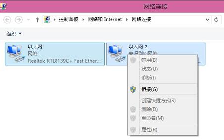 - 首先在windows 8上設(shè)置網(wǎng)卡的IP信息,設(shè)置完成后選擇兩塊網(wǎng)卡,單擊右鍵,選擇橋接。